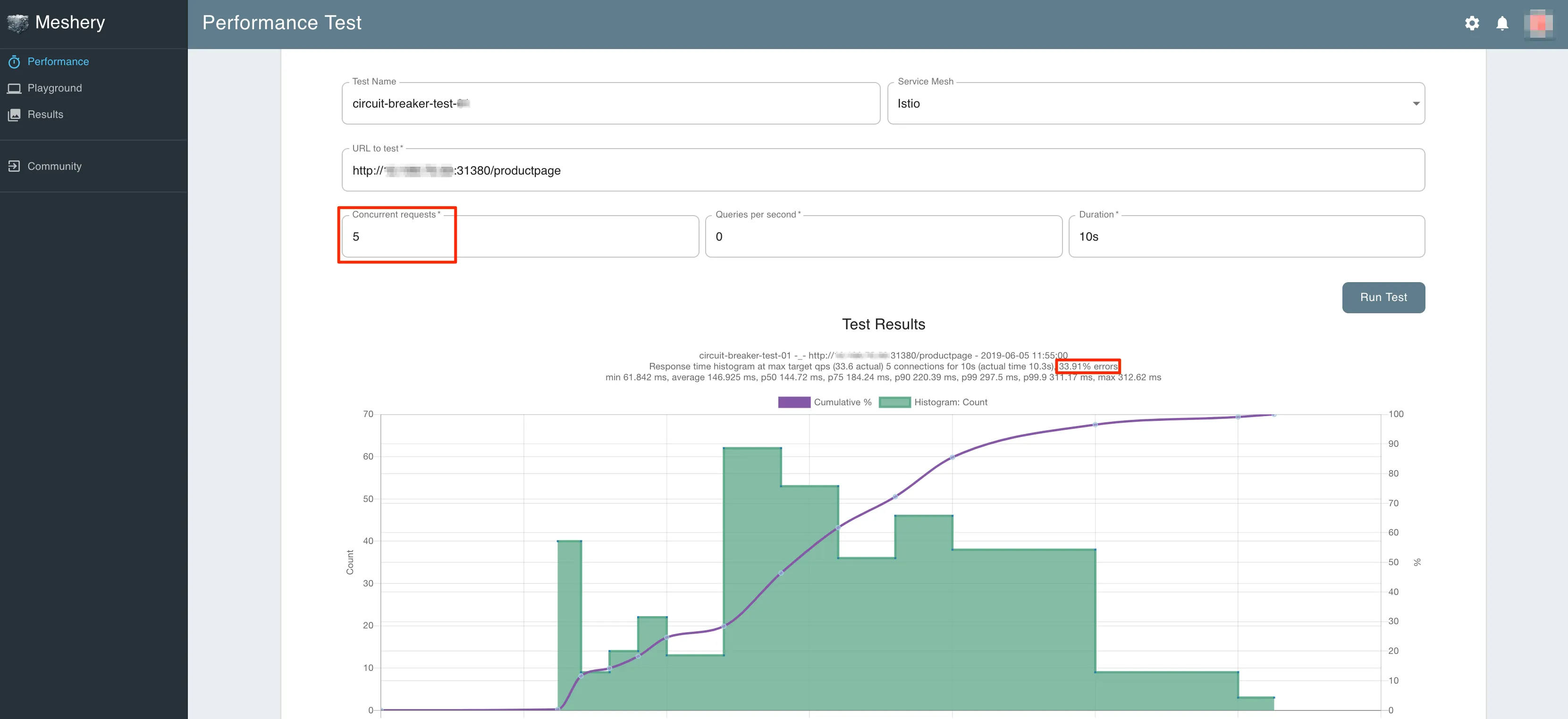 Let us now use Meshery to make several calls to product page app by changing the number of concurrent connections to 5 from within Meshery's Performance page.